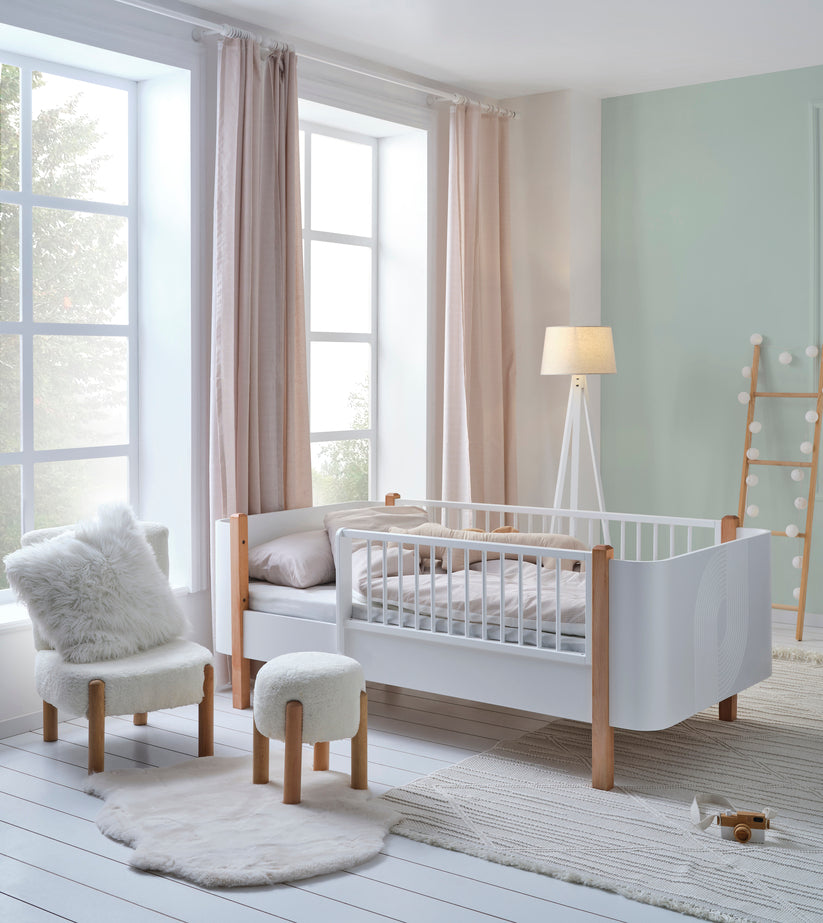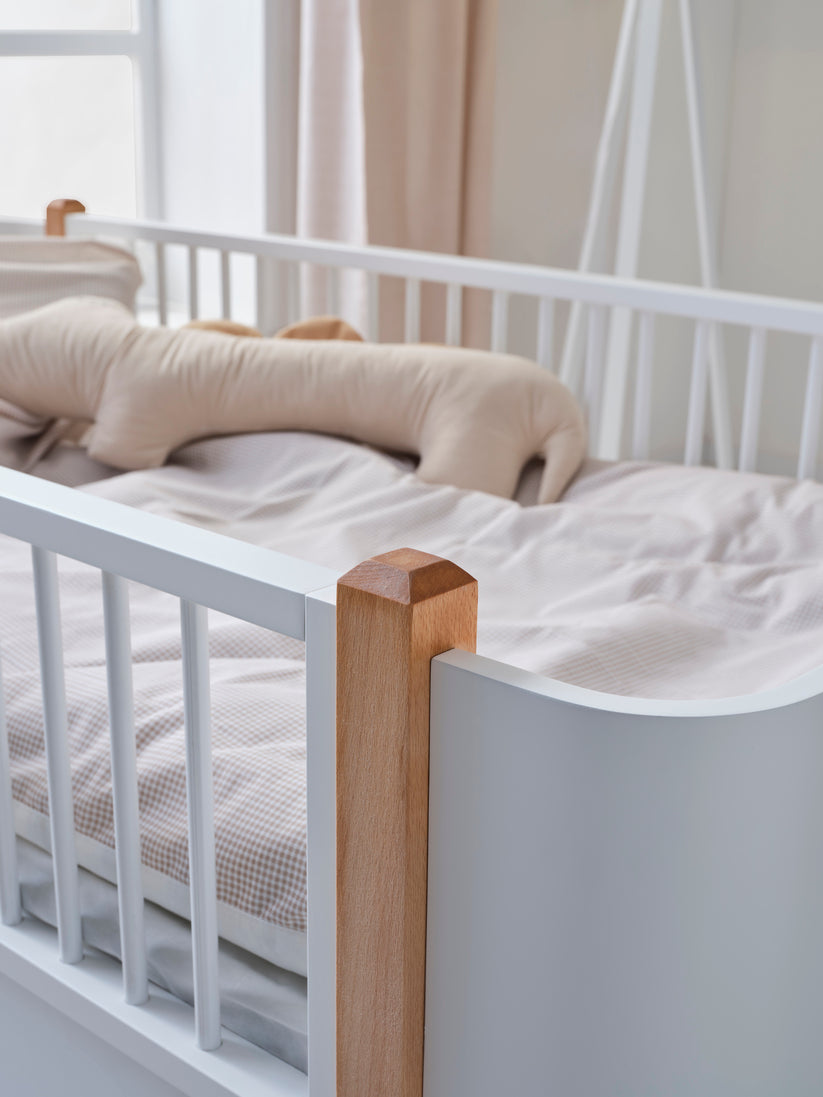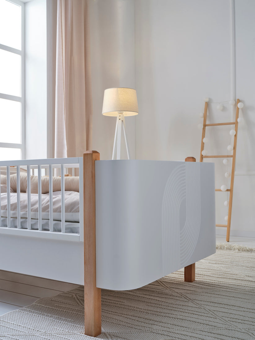 Doğal ahşap ayaklar ve beyaz gövdeyle bütünleşen beşik, hem modern hem de zamansız bir tasarım sunuyor. Kullanışlı yapısı sayesinde bebeğinizin büyüme sürecine uyum sağlar, dekoratif bütünlüğüyle de her köşesi düşünülmüş bir ortam yaratır.