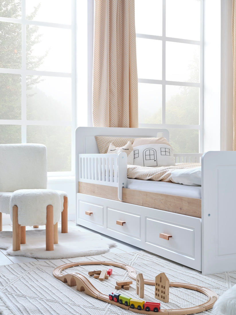 Geniş depolama alanları, güvenli yatak tasarımı ve uyumlu mobilya seti ile Lucia, bebeğinizin ilk odası için ideal bir tercih. Hem ebeveynlerin beklentilerine hem de miniklerin ihtiyaçlarına cevap verirken, şıklığıyla da dekorasyonun tamamlayıcı parçası olur.