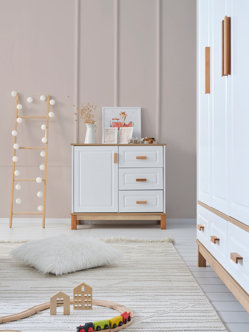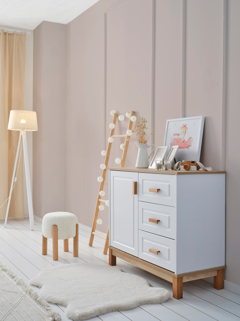 Lucia Bebek Odası, beyazın sadeliğini doğal ahşap dokularla buluşturarak huzurlu ve sıcak bir atmosfer yaratıyor. Modern çizgileri, zamansız tasarımı ve fonksiyonel detaylarıyla hem estetik hem de kullanışlı bir yaşam alanı sunuyor.