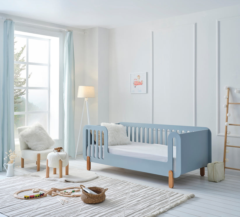 Praz Karyola, sade çizgileri, yuvarlatılmış köşeleri ve modern renk paletiyle çocuk odalarına şıklık ve işlevsellik kazandırıyor. Pastel mavi tonun huzur veren etkisi ve doğal ahşap ayaklarla tamamlanan bu tasarım, minimal ve zamansız bir görünüm sunar.